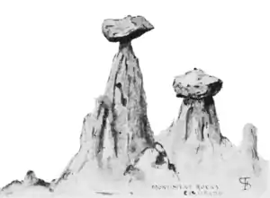 Fig. 11.—Basalt Topping Earth. are in the midst of "The Land of Standing Rock," as the Indians call it. Powell, in referring to this locality, says: "We must-not conceive of piles of bowlders or heaps of fragments, but a whole land of naked rock, with giant forms carved on it; cathedral-shaped buttes towering hundreds or thousands of feet; cliffs that can not be scaled, and cañon walls that shrink the river into insignificance; with vast hollow domes, and tall pinnacles and shafts set on the verge overhead." Year and far in all directions the eye encounters pinnacle after pinnacle, butte after butte, cliff after cliff, like a stone forest, impassable, impenetrable, except to the trained