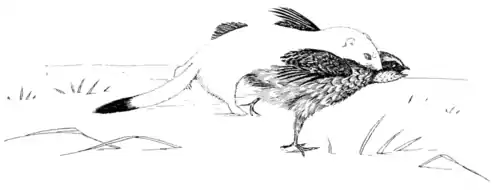 short hair and without any black whatever. Late in the autumn or early in the winter the ermine changes from reddish-brown to white, sometimes slightly washed with greenish-yellow or cream color, and again as brilliantly white as anything in Nature or art; the end of the tail, however, remains intensely black, and at first thought might be supposed to make the animal conspicuous on the white background of snow, but in reality has just the opposite effect, Place an ermine on new-fallen snow in such a way that it casts no shadow, and you will find that the black point holds your eye in spite of yourself, and that at a little distance it is quite impossible to follow the outline of the weasel itself. Cover the tail with snow, and you can begin to make out the position of the rest of the animal, but as long as the tip of the tail is in sight you see that and that only. The ptarmigan and northern hare also retain some spot or point of dark color when they take on their winter dress,