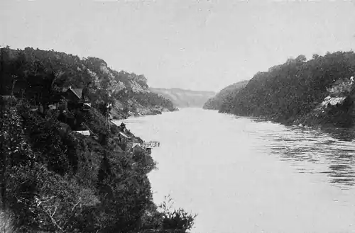 Fig. 3.—Looking up the gorge from near Lewiston, showing on the left the exposed situation of the eastern face of the gorge at the extreme angle, where the measurements were made.