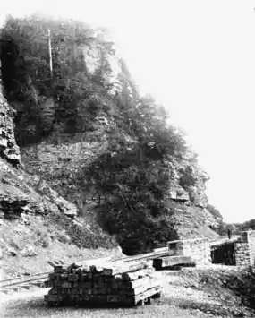 But that is not all. The accompanying photogravures indicate an actual amount of removal over a part of the area enormously in excess of the rate supposed. Fig. 5 shows a portion of the precipice, a hundred feet high, where the road first comes down to the level of the Clinton limestone, and where, consequently, the whole thickness of the Niagara shale is accessible to examination. Fortunately, Patrick MacNamara, the watchman at this station, was a workman on the road at the time of its construction in 1854, and has been connected with the road ever since, having been at his present post for twelve years. We have therefore his distinct remembrance, as well as the appearance of the bank, to inform us where the face of the original excavation then was. In the picture he is standing at the original face, while the other figure is nearly at the back of the space which has been left empty by the crumbling away of the shale. The horizontal distance is fully twenty feet, and the rocks overhang to that amount for the whole distance exposed in the photograph. All this amount of shale has fallen down in forty-four years, making a rate many times larger than the highest we have taken as the basis of our