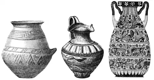 line, its decoration is most effective; yet it betrays greater skill in geometrical design than in the representation of animate life. The dog drawn on the girdle is still far from lifelike. Then come—probably after inspiration from Greek art—the possibilities in complex ornamentation represented by our third specimen. Not more pleasing