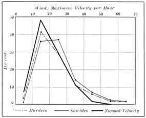 Fig. 2. the law of probability would give us the same per cent of the crime for the year on such days if this meteorological condition were not effective. What we do find, however, is indicated by the other curves, and any increase of crime over expectancy may in this case be ascribed to the wind. We notice that for slight velocities (one to twenty miles an hour) the crime curves are below that of expectancy, but we can see that if the sum of all the per cents for any one curve is one hundred, and one is forced above the other at any part, there must be a corresponding deficiency at some other part. So we may, perhaps, with justice suppose that these mild velocities do not exert a positively quieting effect emotionally, but simply a less stimulating effect than the higher ones. For velocities of between twenty and thirty miles a marked effect is noticeable, and under those conditions the proportion of suicides to that expected is 37:29; velocities of from thirty to forty miles, 14:11; of forty to fifty miles, 7:2; of fifty to sixty miles, 0.4:2.6; of fifty to sixty miles, 0.2:2. The curve for murders shows the increase to be slightly less than for suicides, but the same general relation is preserved throughout. The value of such curves is, of course, somewhat proportional to the number of observations made and recorded, and we must confess that two hundred and sixty (suicides) and one hundred and eighty (murders) is a hardly sufficient number from which to deduce a definite law, but we can hardly doubt, even considering this somewhat limited number, that the wind is, in our problem, a factor of no mean importance.