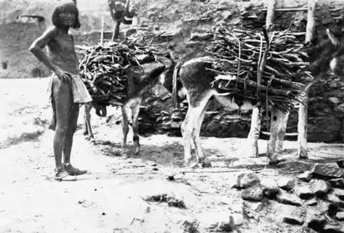 the spindle is held under one foot while he straightens out the thread preparatory to winding it.