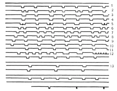 A Short Section from the Paper Band of the Chronograph Cylinder, showing Tracings of Pen connected with Clocks: 1, seconds of sidereal clock; 2. both sidereal and common clocks; 3-10, the tracings of the mean-time clock fall steadily behind the other; 11. sidereal only; 12, connected with observer's key. The extra teeth show when a star passed each of the five spider lines. At the extreme right is a "rattle," put in to show where the observation is on the cylinder.