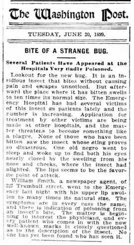 newspapers took the matter up. The New York, Philadelphia, and Baltimore papers soon followed suit. The epidemic spread east to Boston and west to California. By "epidemic" is meant the newspaper epidemic, for every insect bite where the biter was not at once recognized was attributed to the popular and somewhat mysterious creature which had been given such an attractive name, and there can be no doubt that some mosquito, flea, and bedbug bites which had by accident resulted in a greater than the usual severity were attributed to the prevailing oscillatory insect. Ill Washington professional beggars seized the opportunity, and went around from door to door with bandaged faces and hands, complaining that they were poor men and had been thrown out of work by the results of "kissing-bug" stings! One beggar came to the writer's door and offered, in support of his plea, a card supposed to be signed by the head surgeon of the Emergency Hospital. In a small town in central New York a man arrested on the charge of swindling entered the plea that