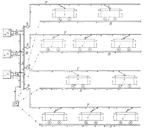Fig. 22.-Diagram illustrating the Manner in which the Electric Current flows from the Generators to the Cars upon the Tracks.