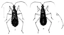 Coriscus subcoleoptratus: a, wingless form: b, winged form; c, proboscis. All twice natural size. (Original.) attention this summer was that of a Swedish servant girl, in which the insect was caught, where the sting was upon the neck, and was followed by considerable swelling, Le Conte, in describing it under the synonymical name Reduvius pungens, gives Georgia as the locality, and makes the following statement: "This species is remarkable for the intense pain caused by its bite. I do not know whether it ever willingly plunges its rostrum into any person, but when caught or unskillfully handled it always stings. In this case the pain is almost equal to that of the bite of a snake, and the swelling and irritation which result from it will sometimes last for a week. In very weak and irritable constitutions it may even prove fatal."[1]