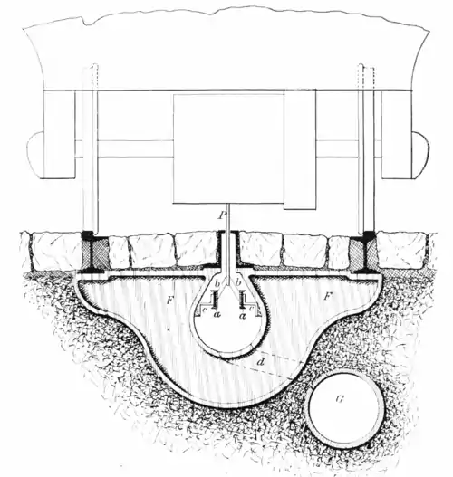 tially filled with water. If water could be excluded from the conduit, the casing; c c, in the first figure, and the tube f, in the second one, would not be required, for there is no difficulty in providing an insulating support that will hold the conductor firmly in place and at the same time prevent the escape of the current; but as soon as moisture collects upon the surfaces of the insulating supports it acts as a conductor, and thus renders the insulation of little value.