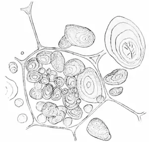 It will be no new surprise to state, by way of introduction to the subject, that starch is the ordinary everyday product of ordinary everyday plants. So humble a vegetable as the potato has gained its way into all lands of the Fig. 1.—Starch Granules of the Potato. more civilized peoples almost solely because it has a habit of storing away, in large underground stems, a vast amount of starch. Let this provident tendency disappear in this plant for a single season, and the crop growers would discard it from their list of remunerative plants, while millions of people would turn with dismay to some other source of a daily supply of starch. What this change in the nature of a single kind of plant would mean to the human race words can not describe. If the famine in Ireland of 1845 and some later years, induced by a rot in the potato, is any index, the misery would be