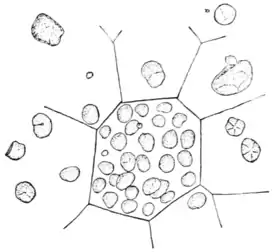 If the starch' factories do not make, in the true sense, the product of their mills, it may be to the point to consider how this all-important substance comes into existence. The organic chemist tells us that starch is a ternary compound, and this agrees closely with the definition laid down by the dictionaries, only they add that it is odorless, tasteless, and insoluble in water. It is one of the proximate principles of plants, and is stored in the form of granules wonderfully variable in size and shape, but each kind having a type that is adhered to with much regularity. For example, the ordinary potato (Solanum tuberosum L.) produces a starch granule that is characterized by a form resembling the shell of the oyster. Fig. 1 is from a camera drawing of a cell from the center of a potato, with portions of adjoining cells, all of which were packed full of starch, a few grains only being represented.