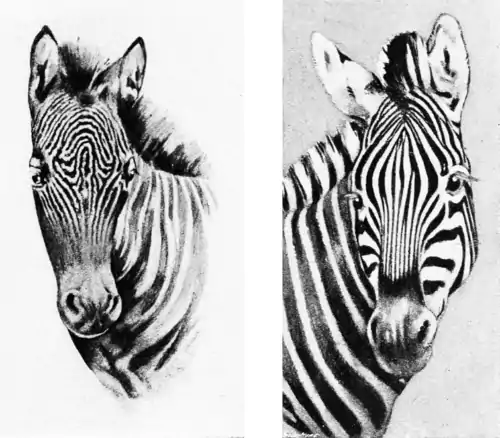 - ↑ The illustration shows the difference between the facial marks of the zebra and those of the hybrid. The latter, in this respect, bears much the same relation to the former as a blue-rock pigeon does to a fancy type.