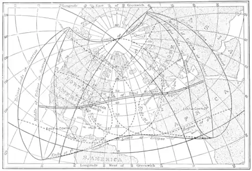 Chart VII.—The Path of the Total Eclipse of may 28, 1900, with Times of Beginning and Ending at Several Places and the Northern and Southern Limits of the Partial Eclipse.