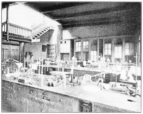 The first laboratory to be established at the institute was that of chemistry, and this leads us to speak first of the department of chemistry. The laboratory of general chemistry was opened in 1876 under the direction of Professors Eliot[1] and Storer, and is believed to be the first laboratory where instruction was given in general chemistry to classes of considerable size. From small beginnings, this department has rapidly grown under the able direction of such men as James M. Crafts, (since 1897 president of the Institute), William Kipley Nichols, Charles H. Wing, Lewis M. Norton and Thomas M. Drown, until now the instructing force consists of five professors, thirteen instructors and six assistants, a total teaching force of twenty-four, in addition to seven or eight lecturers on chemical subjects. The department occupies the two upper floors in the Walker Building, together with about half of one floor in the Henry L. Pierce Building, devoted to industrial chemistry. The laboratories, which are said to be the