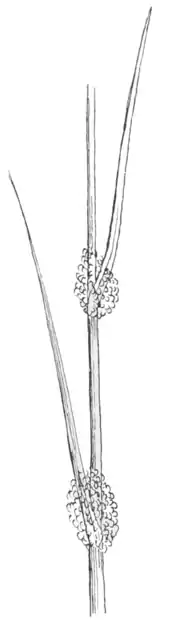 Fig. 1.—Grass stalk and leaves, showing appearance of froth. which in its full growth still lives upon grass, and is easily recognized by its triangular shape and its ability of jumping like a grasshopper. There are a number of species; the one living on grass apparently confines itself to the grass alone, though I have seen one species that frequents a number of different plants. A species found on the white pine is dark brown in color, and the froth in which it is found not only hangs pendent from the branch, but the lower portion appears as a large drop of clear water.