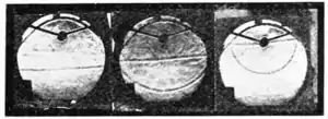 If now our mirror is a portion of a sphere instead of a paraboloid, our reflected wave is not flat, and the reflected rays are not all parallel, the departure from parallelism increasing as we consider rays reflected from points farther and farther away from the center of the mirror. A photograph illustrating the reflection of sound under these conditions is next shown, the echo wave being shaped like a flat-bottomed saucer. As the saucer moves upward the curved sides converge to a focus at the edge of the flat bottom, disappearing for the moment (as is shown in the fourth picture of the series), and then reappearing on the under side after passing through the focus, the saucer turning inside out.