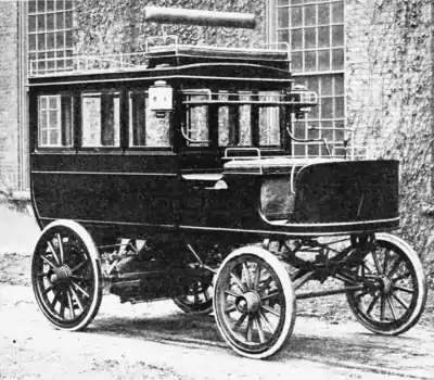 view of the axle and wheels as seen from the front, and the second a view from above. On the left-hand side of Fig. 10, A is the axle proper, and BB are the portions upon which the wheels are placed. The central part A is held rigidly to the body of the vehicle or to the truck which carries it, and the ends BB are swung round the studs PP in a manner more clearly indicated on the right-hand side. Here the levers CC are shown, and these extend from the side of BB. The right-angle lever E is connected with the steering lever G by means of rod F, hence, when G is moved, rod D moves, and thus levers CC are rotated round the studs PP, and in that way the supporting studs BB