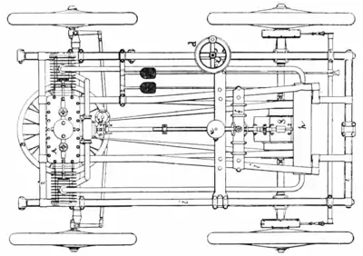 Fig. 11 shows the plan of a light French carriage, which is equipped with a double cylinder motor, set in a horizontal position above the front