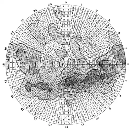 these planispheres. They were constructed by Schiaparelli in the following way: The entire sky was divided into 36 zones by parallels of declination 5° apart. Each zone was divided into spherical trapezia by hour-circles taken at intervals of 5° from the equator up to 50° of north or south declination; of 10° from 50 to 60; of 15° from 60 to 80; of 45° from 80 to 85, while the circle within 5° of the pole was taken as a single region. In this way 1,800 areas, not excessively different from each other, were formed.