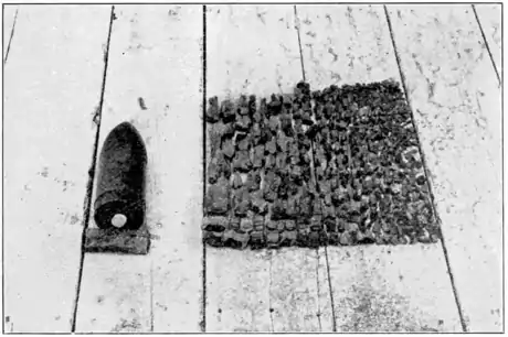 A live-inch armor-piercing projectile was next filled with Maximite and fired through an armor plate, as above described, the projectile being afterwards recovered intact. It was found that the shock had in no way affected the explosive. The shell was then armed with a fuse and fired by electricity. The number and character of the fragments showed that the same force was developed in proportion to the weight of the shell, as in the case of the large 12-inch shell above mentioned, which was exploded in the sand. The five-inch shell is shown in Fig. 2. The fragments recovered after the explosion are shown on the right of the shell.