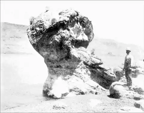Upon the eastern side of the islands, rising from the edge of the water there is a most picturesque deposit, known as the mushroom rock and shown in the accompanying photograph. Rising from a firm base, the deposit becomes smaller, and then at the top swells out in a spherical head.