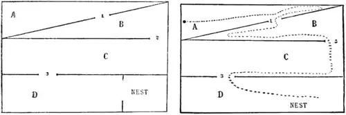A is the space in which the animal was placed to start, the starting-point being marked by a dot (.). The corner marked nest contained a mass of damp grass and was darkened. When everything was ready for an experiment the animal was placed in A at the dot and allowed to wander about until it found the nest by passing through the openings marked 1, 2 and 3.