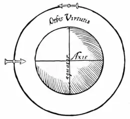 At any rate, Gilbert is quite certain that whatever magnetism may be, it is not, like electricity, a material, ponderable substance; he ascertained this by weighing in the most accurate scales of a goldsmith a rod of iron before and after it had been rubbed with the lodestone, and then observing that the weight is precisely the same in both cases, being 'neither less nor more.' He discovers also that not only the magnet, but all the space surrounding it, possesses magnetic properties; for the magnet 'sends its force abroad in all directions, according to its energy and quality.' This region of influence he calls orbis virtutis, a sphere, or, as we call it, a field of force. With wonderful intuition, he sees this space filled with lines of magnetic virtue passing out radially from his spherical lodestone, and he calls these linesFig. 1. Gilbert's Spherical Lodestone and Field of Magnetic Force.radii virtutis magneticae, rays of magnetic force.