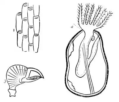 Fig. 5.—Anatomy of a Bryozoon.—1, the skeleton cells; 2. diagram of an individual Bryozoon; a, the region of the mouth surmounted by a crown or tuft of tentacles; 3, an avicularium, or bird's-head process.