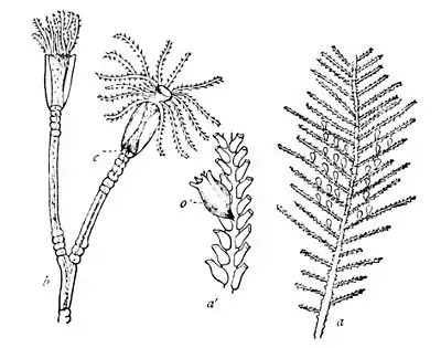 Fig. 6.—Sertularia Pinnata.—a, a fragment, natural size; a', small portion magnified; o, shows the case of a male zooid; b, Campanularia neglecta, magnified.