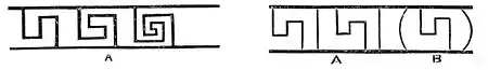 I have observed that in Brazil, and elsewhere in America, the artist has often taken care to separate the units in this fret from one another, either by drawing lines between them, as in Fig. 8, A, or by placing them in cartouches, B. The addition of the line in A enhances the beauty of the series by breaking up the monotony and introducing a pleasing alternation. The attempt to separate the units resulted, however, in bringing about their firm union; for it was observed