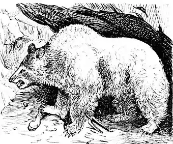 One of the most curious members of the bear family is the Asiatic or sloth bear (Ursus labiatus). It is distinguished from other bears by the length of its hair, the length and flexibility of its lips, and the peculiar manner in which the fore-feet cross each other in walking. Its fur is deep-black, slightly flecked with brown, but it has a forked patch of white upon the breast. The hair from the head and neck hangs down over the face, and gives the animal a weird appearance. It seems to be subject to the early loss of its incisor teeth, from the absence of which, in the first specimens carried to England, it was supposed to be a species of gigantic sloth. It is almost wholly a vegetable feeder, and, it is said, will resort to animal food only in cases of extreme hunger. It is quite harmless unless retreat is cut off, when, like its relatives, it becomes savage and dangerous. The mother will fight bravely in defense of her young, which she usually carries upon her back until they have acquired strength enough to make good travelers. It is an inhabitant of the Himalayas, where it remains in caves