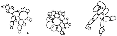 | Fig. 12.—Cell and its Buds. | Fig. 13.—The Baby Torulæ grouped around their mother. | Fig.—14.—Cells linked together in Chains. |