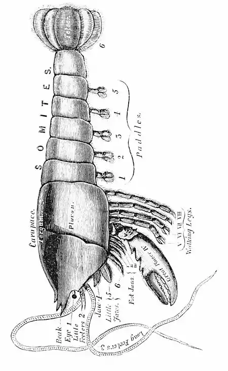 abdomen—which is made up of seven pieces or joints. The first six joints are called somites (Fig. 15) or bodies, and the last joint or tail-piece is called a telson, which means end. So the body of the lobster is made up of six somites and a telson. Each body-piece has a pair of soft-jointed paddles on its under side (Figs. 15, 16), and these are