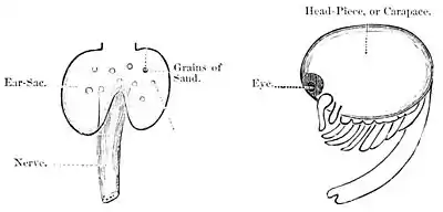 called the coral. The baby-lobsters differ greatly from their parents. Their eyes are very large, and set in the head instead of on eye-stalks. They have a great rounded head-shield (carapace) and a small body (Fig. 31). The limbs are not at all like the lobster's; altogether, he looks as if his eyes and head were running away with him. As soon as he is hatched he begins to swim about and feed himself, and never