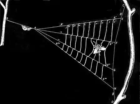 struck the net in passing—it may have touched a single double line—but this adheres with the greatest tenacity, and is so elastic as to yield without breaking, so that each struggle involves the victim still more, and may even bring it into contact with the next interradial. As soon as the violence and repetition of the vibration indicate that an insect is really entangled, the spider awakes from her apparent apathy; she lets go with her hinder feet; the net, released from its tension, flies forward, and at the same time flaps from side to side.