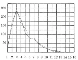 The graphic exhibition of this result is made by the well-known method of rectangular coordinates, using the number of letters in a word as the abscissa and the corresponding number of words in a thousand as the ordinate. On a sheet of 'squared' paper the numbers showing letters in each word, 1, 2, 3, 4, etc., are placed along the horizontal line and on the vertical above each of these is put a point whose distance from the base shows the number of corresponding words in every thousand, according to the scale shown at the left. These points are then joined by straight lines and the whole broken line may be called the 'word spectrum' or 'characteristic curve' of the author as derived from the group of words considered. The group of 1,000 words from 'Vanity Fair' enumerated above is thus graphically represented by the continuous line in Fig. 1, and the method of constructing the characteristic curve will be readily understood by comparing this with the numbers given. As a thousand is a very small number in a problem of this kind, the curve representing any single group of that number of words is practically certain to differ more or less from that of any other such group. In Fig. 1 the dotted line represents a group of 1,000 Fig. 1. Two Groups—1000 each—Vanity Fair. words, immediately following that already referred to. Perhaps the most astonishing thing about these two lines is not that they differ, but that they agree as well as they do. It is really remarkable that any marked peculiarity in the use of words is almost sure to be revealed in this way, even in comparatively small groups. In the two diagrams of Fig. 1 it is interesting to note their general sameness, especially as shown in a tendency to equality of words of six and seven letters and also in words of eleven and twelve letters.