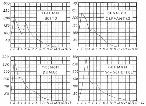 very differently, but their diagrams are strikingly alike in their main feature. As a matter of interest 'counts' were made of groups of about 5,000 words each from various languages other than English. The characteristic curves thus derived for Italian, Spanish, French, German, Latin and Greek are shown in Figs. 2 and 3, and, for convenience in comparison, that of Dickens's English is added. Many of these 'counts' were furnished by friends who became interested in the matter, and an incident of no little interest was the receipt of a column of numbers on a strip of paper with nothing to indicate its origin or meaning. Suspecting, however, that it might be a 'word count,' its diagram was constructed and it was instantly and beyond all reasonable doubt identified as coming from the Latin of Caesar.
