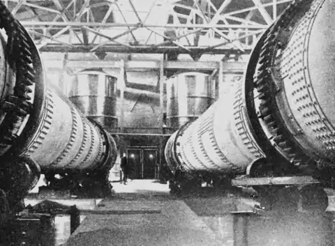 the stone house where the materials are received and sorted, preparatory to being finely ground. A great variety of mills are used for grinding both the crude materials and the cement clinker. So far as the making of the cement is concerned, it does not matter in what kind of a mill the ingredients may be ground, provided they be ground fine and thoroughly mixed in the right proportions. If the mixture is burned dry, the mixing is accomplished by the use of screens and sieves; if it ic burned wet, the grinding is done in a wet mill, the paste being floated off and allowed to settle in large tanks. The dry materials are blown into the kiln. The wet mud is allowed to drip into the upper end of the kiln as it is forced in by a pump.