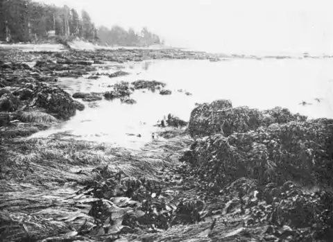 abundantly represented on Vancouver island. Another very distinct instance of zonal distribution is shown in Figure 9, the photograph having been taken at low tide. In the foreground the slender leaves of a marine angiosperm (Phyllospadix scouleri) are seen, spread over which are fronds of Egregia, one of the most notable of the west coast kelps. The sides of the dome-shaped rock are draped with kelp, principally Egregia and Alaria, while the top is covered with a fairly uniform and copious growth of the alga which has passed under the name of Halosaccion hydrophora, but concerning which it is possible that an error has been made by American phycologists.