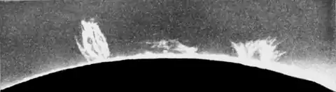 At times of total eclipse it is perhaps possible to obtain better photographs showing finer details than can be made under other conditions. Figure 5 is an enlargement of a photograph made at the eclipse of 1900, by Professor E. E. Barnard, assisted by Mr. G. W. Ritchey. It shows a mass of prominences at the southwest quadrant of the sun. Along the irregular limb of the moon, which appears black, is seen the ragged storm-tossed surface of the chromosphere, of increasing depth toward the right owing to the moon's position at the instant of the exposure. Thrown up from this are the vast fantastic masses of the prominences or 'red flames.' They remind us of pictures which show the effects produced by the explosion of submarine torpedoes. The larger mass at the left rises to the height of 60,000