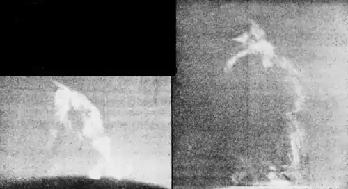 | Eruptive prominence photographed in full sunlight at the Kenwood Observatory, Chicago, March 25, 1895. a, at 10h. 40m. (height, 162.000 miles), b, at 10h. 58m height, 281,000 miles). (Figs. 10 and 11 are reproduced on the same scale.) | ||
