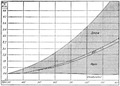 The reader may have noticed that hail falls usually in the summer instead of in the winter, and have wondered what is the reason for it. The answer is simple. If we arrange a diagram so that freezing temperature is on the left and 100 degrees Fahrenheit on the right, and plot the limits of the rain, hail and snow regions in altitude, the result is shown in a set of curves which indicate the height at which it is possible for them to form respectively. In the summer when the