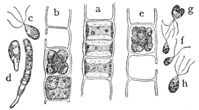 many months, but at times the conditions are such that another form of swarm-spore appears. These elements are much smaller than the usual zoospores, are developed more numerously in the mother cell and have 2 cilia as is shown in Figure 2, e, f. They are gametes and as a rule fuse readily with one another in pairs. The free-swimming gametes are shown in Figure 2, f, and two stages in the conjugation appear in g and h. If conjugation does not take place, the gametes settle down and in certain instances have been observed slowly germinating; but they develop feeble plants.
