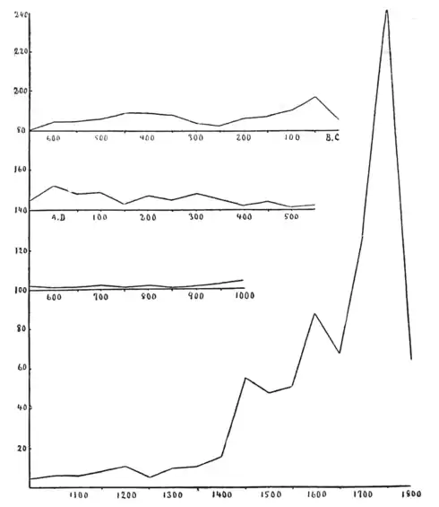 The Curve Represents the Distribution of the Thousand Most Eminent Men of History from 600 b. c. to the First Half of the Nineteenth Century. The numbers are given on the left side, the ordinates or height of the curve above the base line representing the number of eminent men born in each half century. Thus there were five preeminent men born between 600 and 550 b. c. and 241 in the second halt of the eighteenth century. As men attain eminence about fifty years later than they are born, the periods of productivity are one place further to the right.