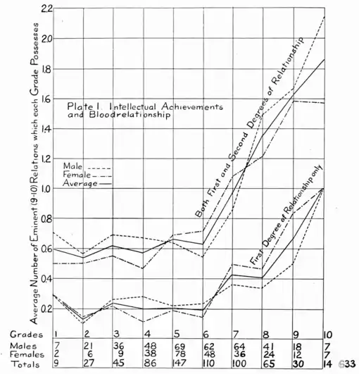 In the second degree of relationship the average of the 9, 10 have about 1.7 eminent relations while the mediocrities have about .6. In the first degree the average of the 9, 10 have about .85 eminent relations while the mediocrities have but about 2.. In other words, in
