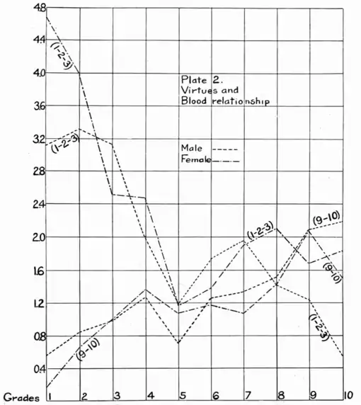 Since there are eighteen persons in this group, the fractions 30/18 and 9/18 give us the averages 1.67 and .50 seen in Plate I. to be the figures for grade 9.