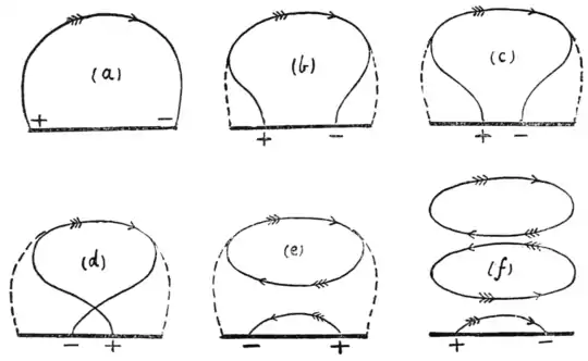 enough to keep up with the course of events, or movements of the electrons in the rods, and hence their regular contraction and absorption is changed into a process of a different kind. As the electrons and coelectrons, i. e., the electric charges, vibrate to and fro, the lines of electric strain connecting them are nipped in and thrown off as completely independent and closed lines of electric strain, and at each successive alternation, groups or batches of these loops of strain are detached from the rod, and, so to speak, take on an independent existence. The whole process of the formation of these self-closed lines of electric strain is best understood by examining a series of diagrams which roughly represent the various stages of the process. In Fig. 2 we have a diagram (a) the curved line in which delineates approxi-