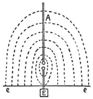 Fig. 4. Lines of Electric Strain (Dotted Lines) extending between a Marconi Aerial A and the earth ee before discharge.charge, so to speak, overshoots the mark, and the wire is then left with a charge of opposite sign. This again in turn rebounds, and so the wire is discharged by a series of electrical oscillations, consisting of alternations of* static charge and electric discharge. We may fasten our attention either on the events taking place in the vertical wire or in the medium outside, but the two sets of phenomena are inseparably connected and go on together. When the aerial wire is statically charged, we may describe it by saying that there is an accumulation of electrons or coelectrons in it. Outside the wire there is, however, a distribution of electric strain, the strain lines proceeding from the wire to the earth (see Fig. 4).