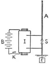 Fig. 3. Simple Marconi Radiator. B, battery; I, induction coil; K, signalling key; S, spark gap; A, aerial wire; E, earth plate. of which is attached to one of the spark balls S of an induction coil I, the other spark' ball being connected to earth E, and the two spark balls being placed a few millimeters apart (see Fig. 3). When the coil is set in action, oscillatory or Hertzian sparks pass between the balls, electric oscillations are set up in the wire and electric waves are radiated from it. Deferring for the moment a more detailed examination of the operations of the coil and at the spark gap, we may here say that the action which takes place in the aerial wire is as follows: The wire is first charged to a high potential, let us suppose, with negative electricity. We may imagine this process to consist in forcing additional electrons into it, the induction coil acting as an electron pump. Up to a certain pressure the spark gap is a perfect insulator, but at a critical pressure, which for spark gap lengths of four or five millimeters and balls about one centimeter in diameter approximates to three thousand volts per millimeter, the insulation of the air gives way, and the charge in the wire rushes into the earth. In consequence, however, of the inertia of the medium or of the electrons, the