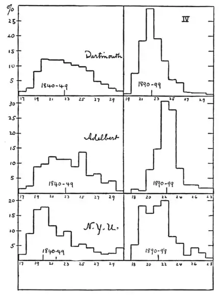 higher average age of graduation than in the earlier decades, we still find no change of any significance. At the very best, or worst, the change in fifty years past has been only three months. While now, if we may use for the sake of further illustration the available data of the colleges for the decade beginning 1900, we find on an average three months less than that of 1850-59. The colleges included here are those seven which furnished for the decade 1890-99 over 81 per cent, of all graduates, and include all the colleges except New York University, Adelbert College, Middlebury College and Syracuse University.