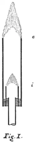 in the outer cone. This separation was first accomplished by Techlu, in France, and Arthur Smithells, in England, working independently, with a piece of apparatus, the essential features of which are pictured in cross-section in Fig. 1. By a proper control of the relative proportions of gas and air the inner cone was made to burn at the orifice i, while the outer cone burned at the orifice o. The outer cone got its oxygen from the surrounding air, while that for the lower flame was supplied along with the gas. The temperature of each cone was measured and the gases entering and leaving each were analyzed. It was found that as the proportion of gas to air was increased, the tip of the inner or lower cone became brightly luminous and a column of soot passed upward through the tube, becoming faintly luminous in the outer edge of the upper flame. As soon as the inner cone becomes luminous the unsaturated[1] hydrocarbon compound known as acetylene begins to appear among the gases passing to the outer cone.
